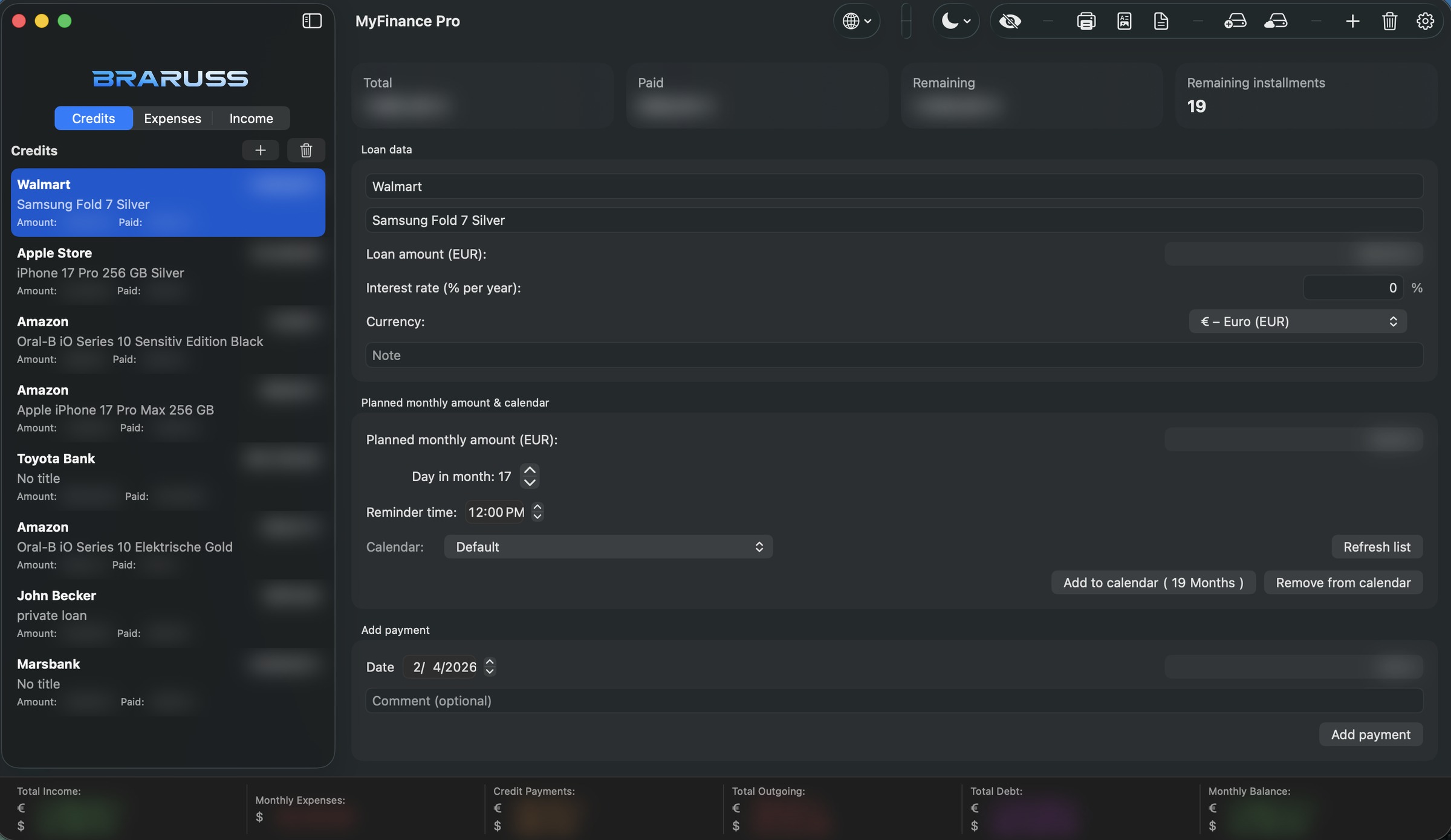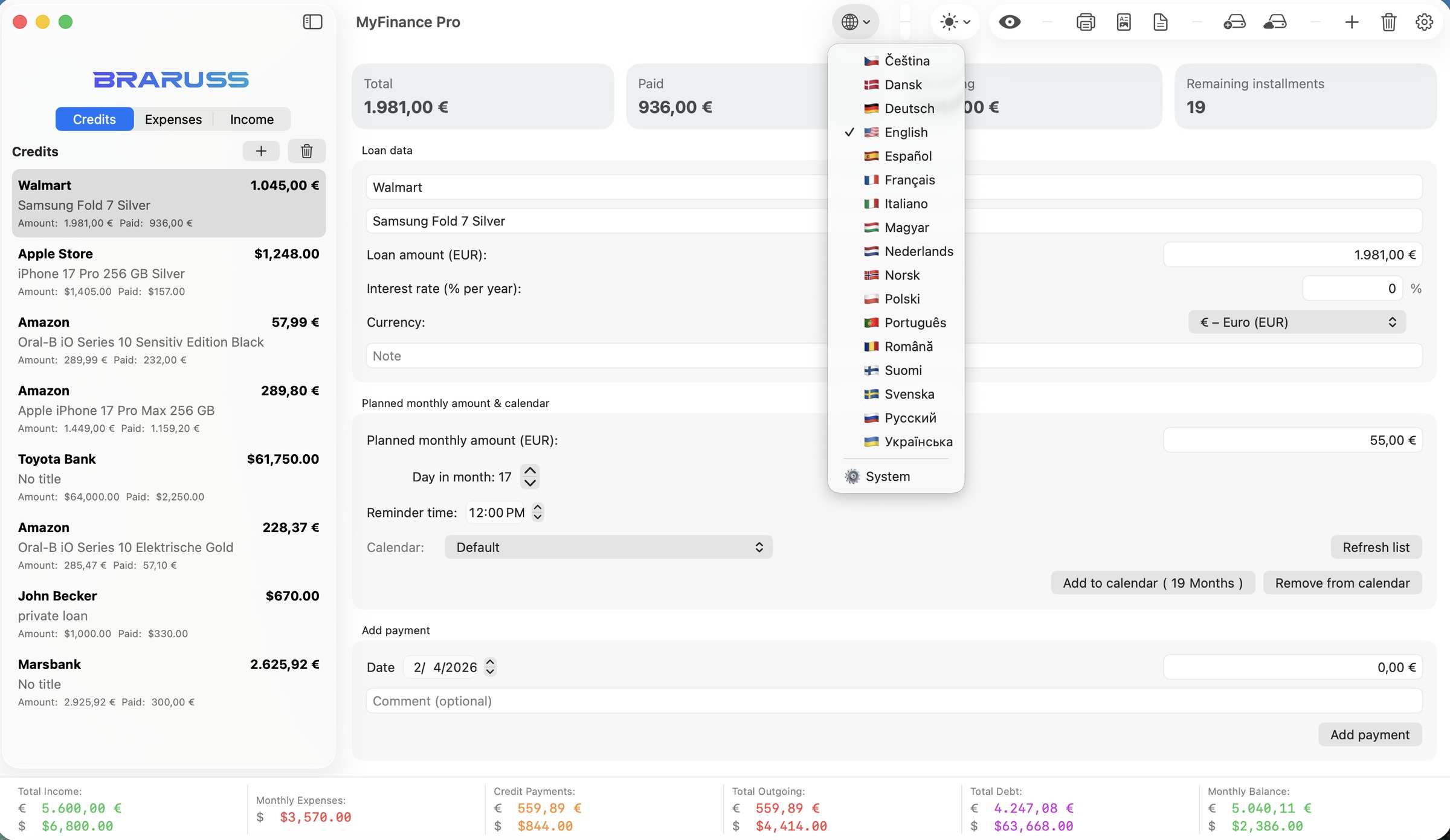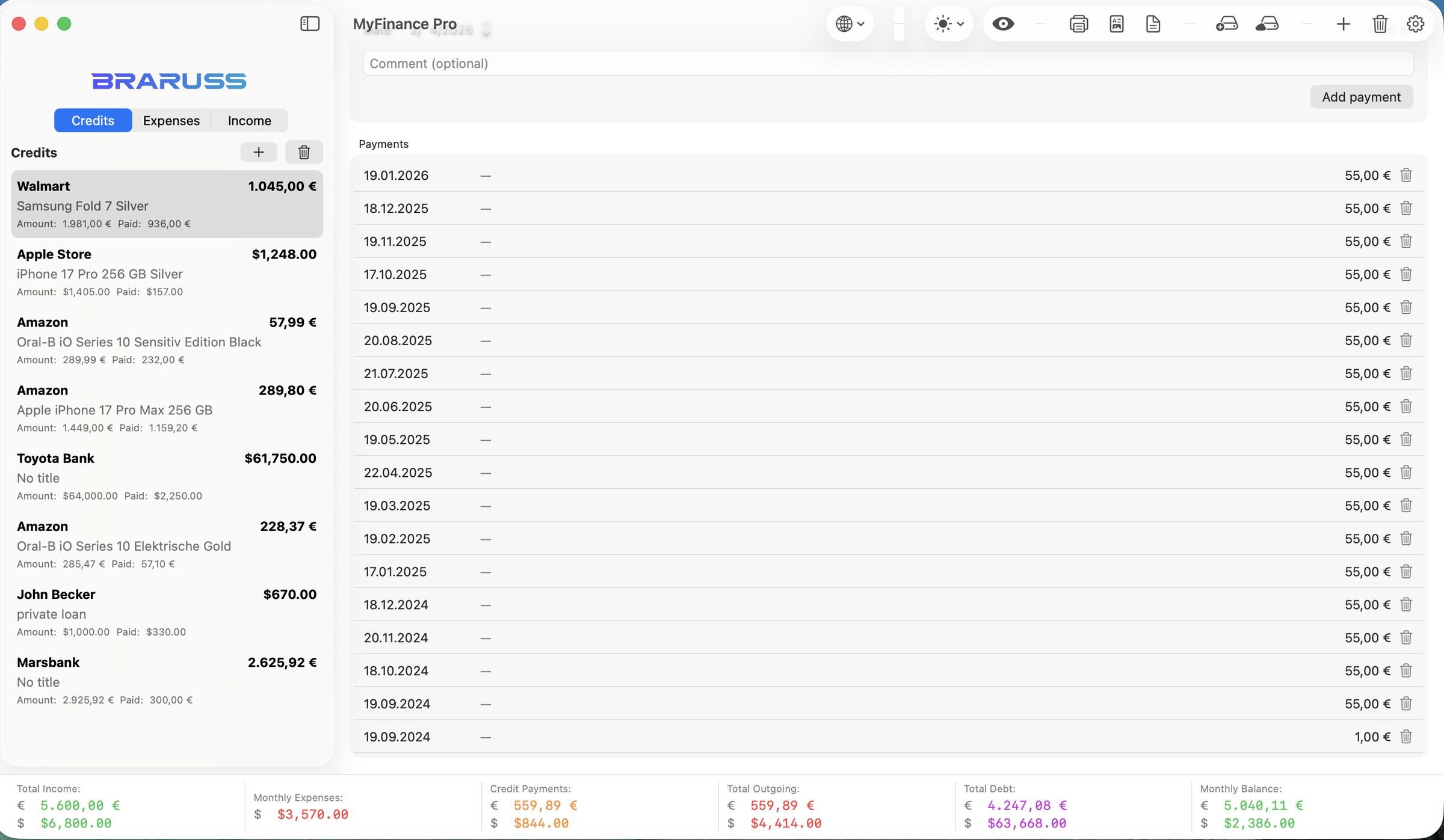 MyFinance Pro — удобный финансовый менеджер для iPhone, iPad и Mac, который помогает держать личные финансы, бюджет и кредиты под контролем: учитывайте ежемесячные доходы и расходы, быстро добавляйте операции за секунды, планируйте платежи через календарь, следите за балансом в наглядном обзоре и используйте инструменты для экспорта, формирования PDF‑отчётов, резервного копирования и защиты данных — быстро и конфиденциально.